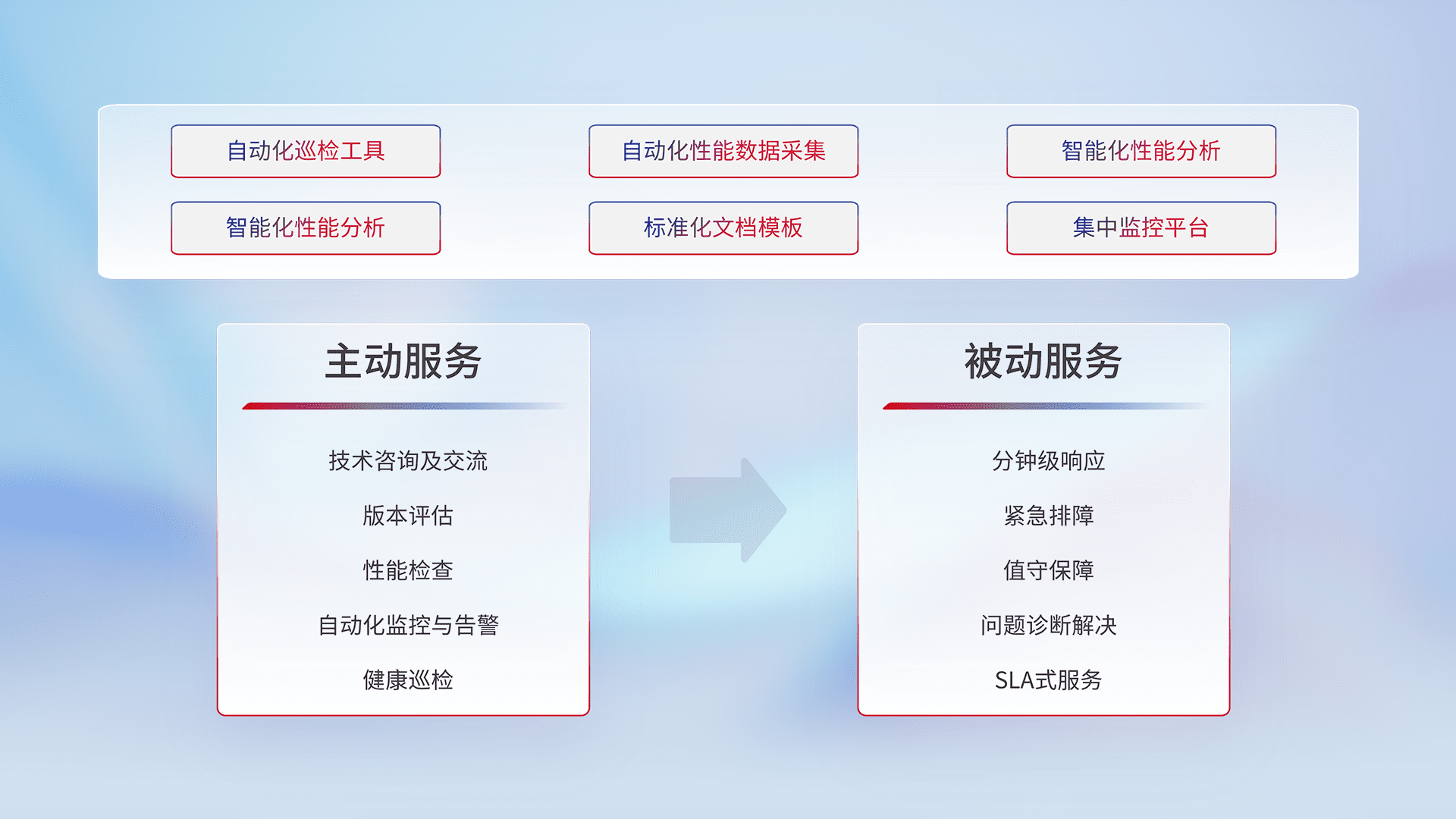 智能化工具和标准化文档,,,保障服务质量,,,提供主动服务(包含技术咨询、、、版本评估、、性能检查、、、、自动化监控与告警、、、、健康巡检)和被动服务包含(分钟级响应、、紧急排障、、、、值守保障、、、、问题诊断解决、、、SLA服务)。。
